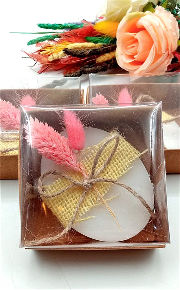Pembe Çiçek Detaylı Sarı Hasır Süslemeli Hediyelik Sabun